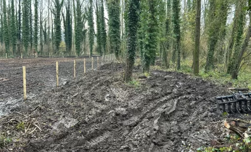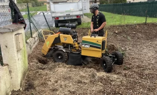 Après l'abattage de près de 60 pieds de Thuyas et de Cyprès, nos clients voulaient faire disparaitre les souches afin de retravailler le sol d'un coté et faire construire un mur de l'autre.